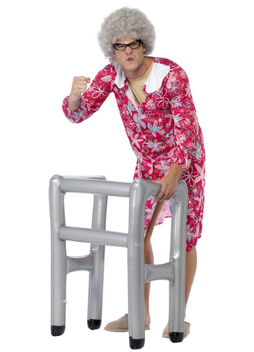 Granny kit consisting of grey curly wig, metal framed glasses & pearl necklace.
