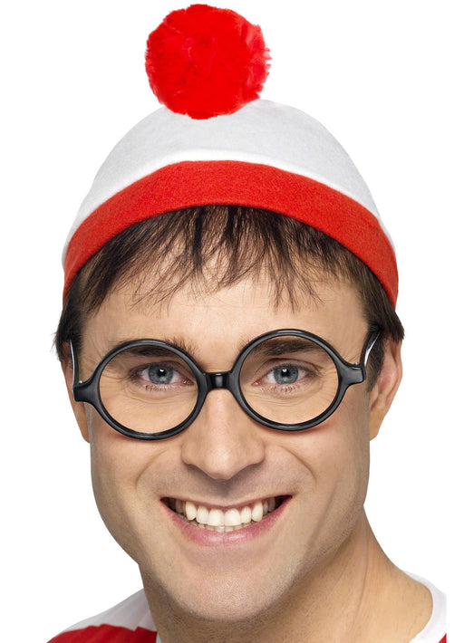Official licensed Where's Wally set consisting of black plastic glasses and white and red bobble hat.