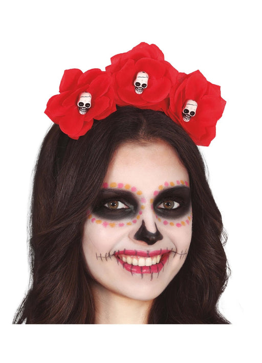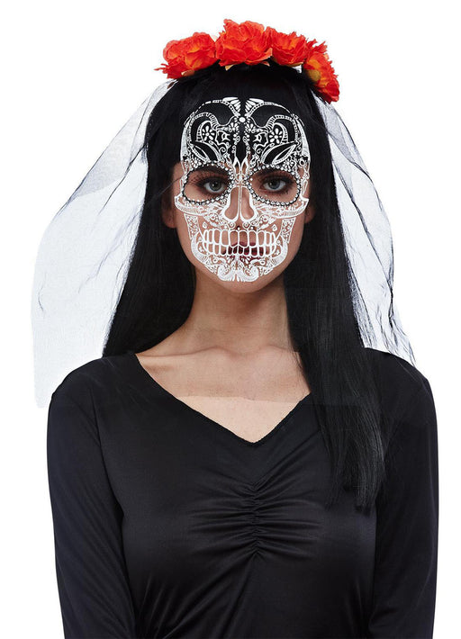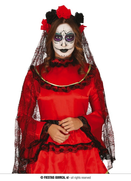Halloween Day of the Dead headband accessory with rose decorative finish and long black lace veil.