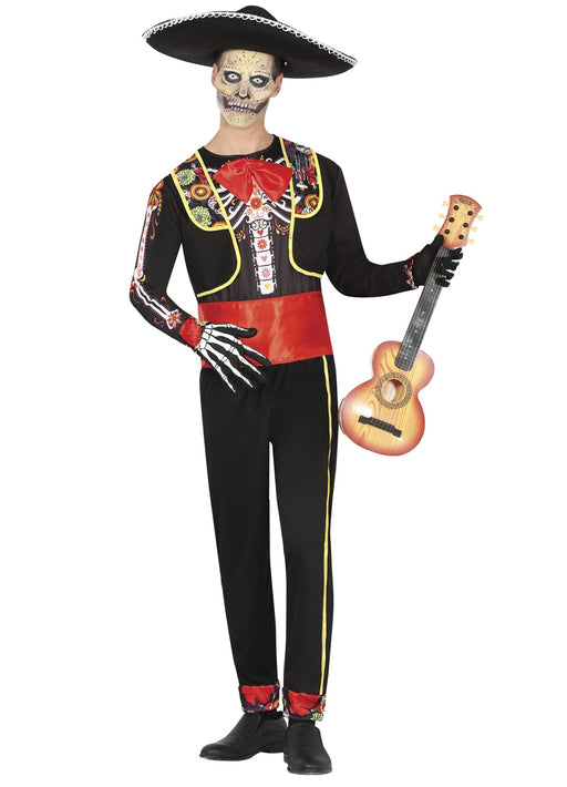 Day of the Dead Halloween costume consisting of one piece printed jumpsuit with attached waistcoat, red bow tie and belt. Pictured sombrero and gl...