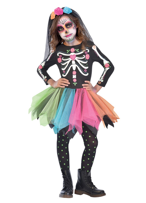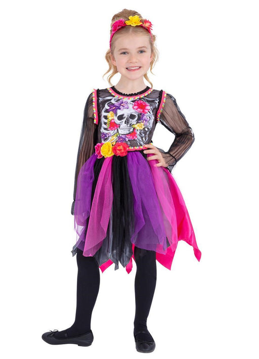 Bring festive flair to Halloween with this colourful Day of the Dead dress for girls, featuring a printed skeleton design and vibrant layered skirt...