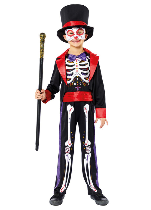 Full Day of the Dead skeleton boy's Halloween costume with all in one top with bow tie and jacket, printed trousers, top hat and material face mask.
