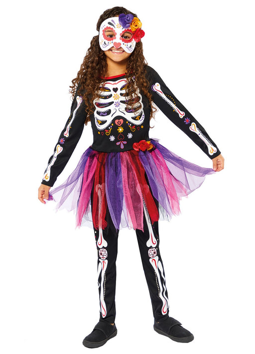 Day of the Dead skeleton girl's Halloween costume with tutu style printed dress, matching leggings and material face mask.