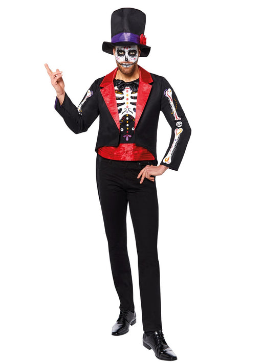 Mexican Day of the Dead Halloween costume with skeleton print top with attached all in one jacket with cummerbund along with black top hat with pur...