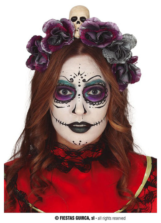 Deep pink and purple coloured rose Day of the Dead style Halloween headband.
