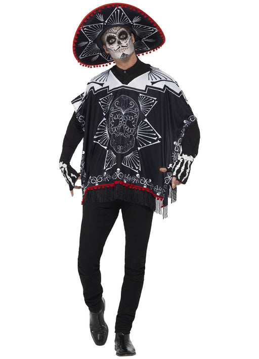 Halloween Day of the Dead bandit fancy dress costume consisting of black and white skull print poncho with red tassels, matching sombrero & pai...