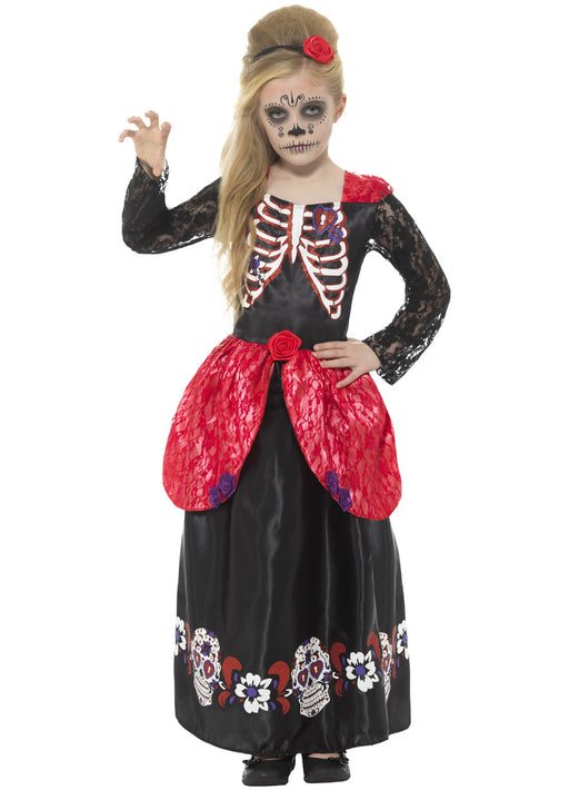 Deluxe Day of the Dead girl costume consisting of long black dress with skeleton glitter print, red lace side panels & black lace sleeves. Also...