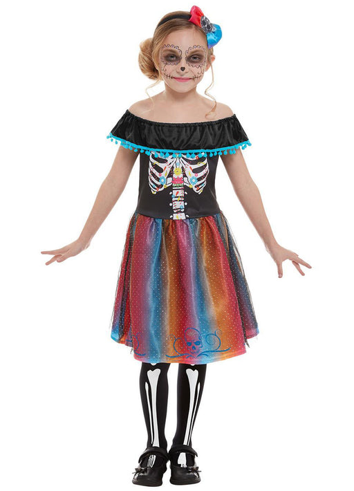Colourful Day of the Dead girl's costume with layered off the shoulder dress with skeleton print and matching headband. Size Age Height Small ...