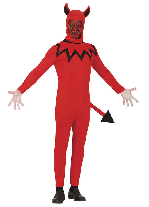 Halloween Devil costume with printed red and black jumpsuit with attached hood with horns and belt with buckle. Model has own make-up, gloves and s...