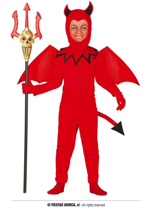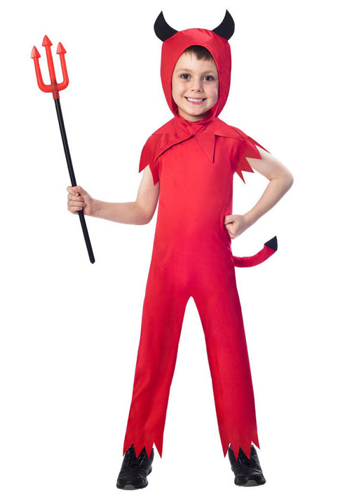 Budget Devil boy's Halloween costume consisting of red jumpsuit with tail and separate hood with black devil horns. Trident not included. Size ...