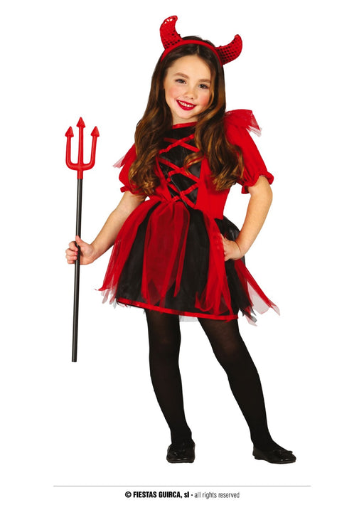Girl's devil Halloween costume with layer dress with faux corset design along with a sequin horn headband. Pictured devil trident available separat...