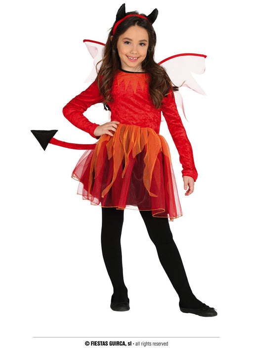 Demon Halloween girl costume with layered tutu dress, wings, tail and black horned headband.