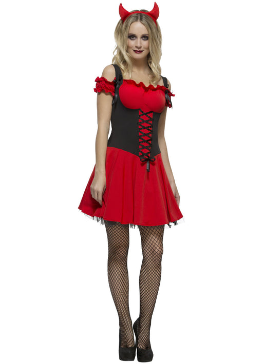 Two piece girl's Halloween devil fancy dress costume with layered corset style dress in red and black along with horns headband.