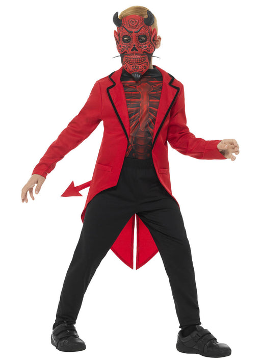 Deluxe devil boy costume with a Day of the Dead twist! Includes EVA mask, tailcoat jacket with black trim and detachable tail along with a black to...