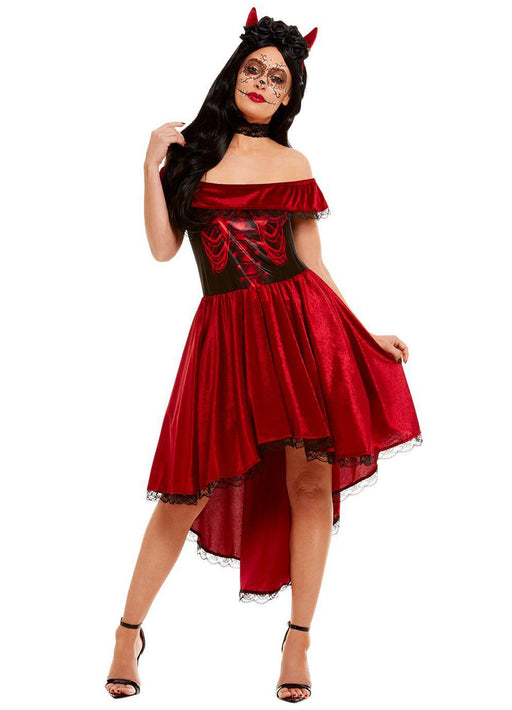 This ladies Day of the Dead costume consists of an off the shoulder red velvet style dress with skeleton print and black lace trim with choker and ...