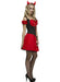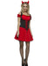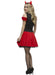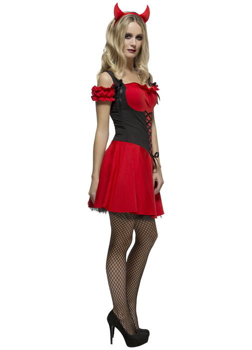 Wicked Devil Halloween costume consisting of red and black dress with shoulder straps, corset style tie to front and black layered underskirt. Also comes with devil headband horns.