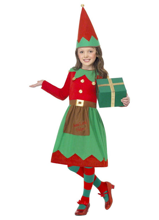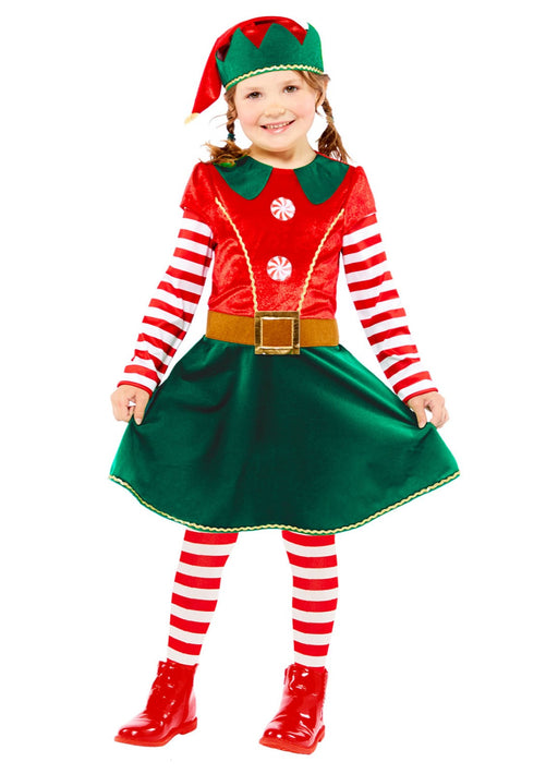 Girl's Christmas elf fancy dress costume consisting of red and dark green dress with faux belt and striped arms along with matching hat. Red and wh...