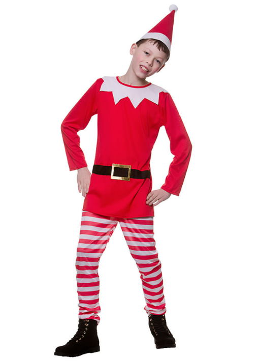 Christmas Elf fancy dress costume with green top with red & white striped arms and fake belt, matching trousers and hat. Shoes are not included...