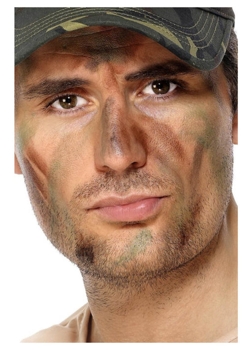 Grease-based make-up kit for face and body to create the army look with applicator and 3 colours - black, green and dark brown.