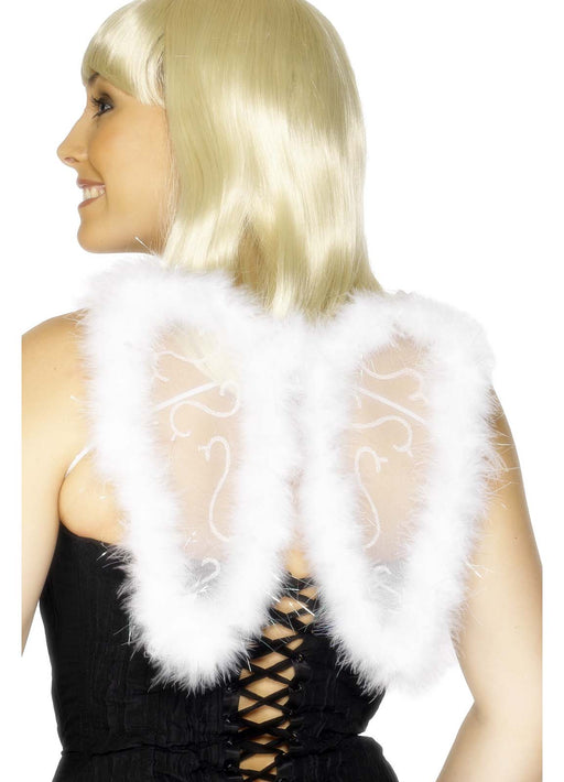 Pair of white feathered Angel wings with elastic shoulder straps measuring approx. 30 cm x 40 cm.