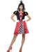 Carded Queen Of Hearts fancy dress costume consisting of short red dress with black top, heart print design, puffed shoulder cuffs and checked stand up collar. Also included is the black crown headpiece & pair of short white gloves.