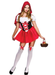 Little red riding hood character costume which includes short red and white dress with attached hooded cape.