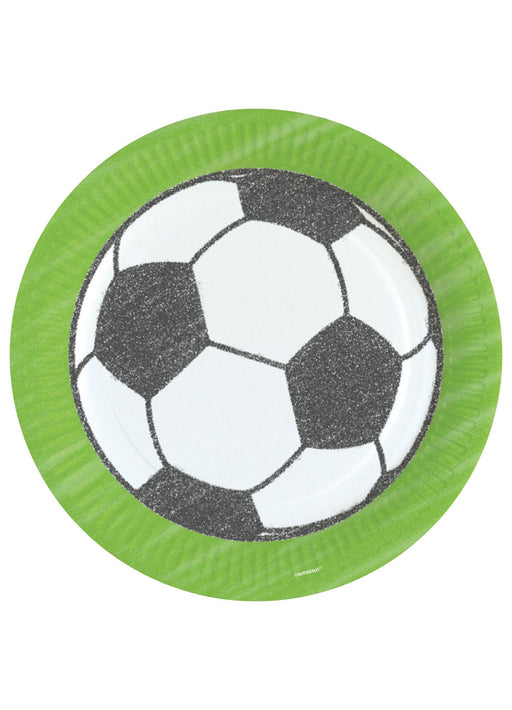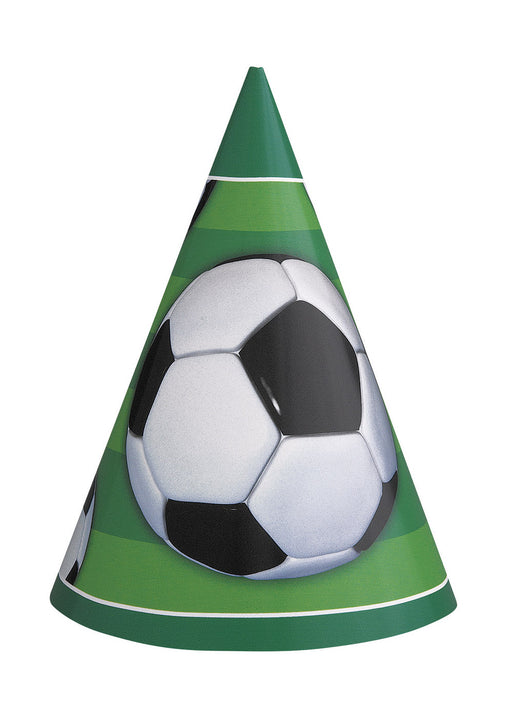 Pack of 8 football themed party hats with elasticated strap decorated with 3D football image.