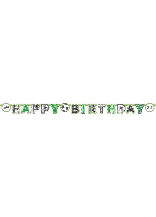 Kicker party football themed Happy Birthday letter banner measuring just over 2 metres.