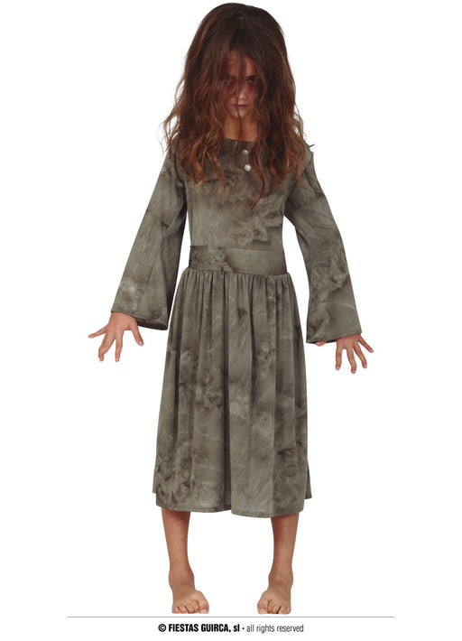 Creepy Halloween ghost girl costume with distressed effect dark coloured dress finished on the neckline with two jewels.