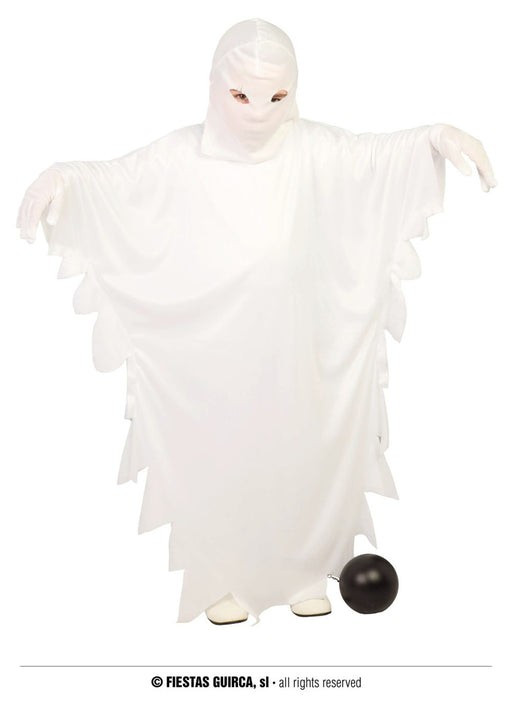 Child's white ghost fancy dress costume with long tunic and hood. White gloves not included.
