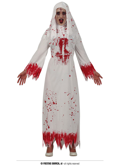 Halloween ghost nun with long white bloodied dress with upside down cross design along with habit headpiece.