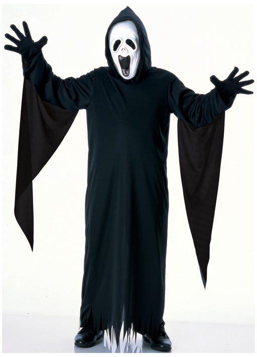 Howling Ghost Halloween fancy dress child's costume with long black hooded robe, pair of black gloves and white Scream mask. Size Age Height ...