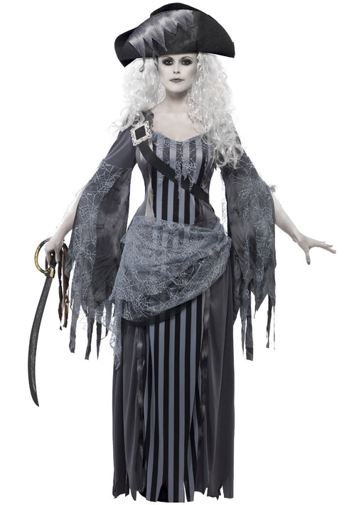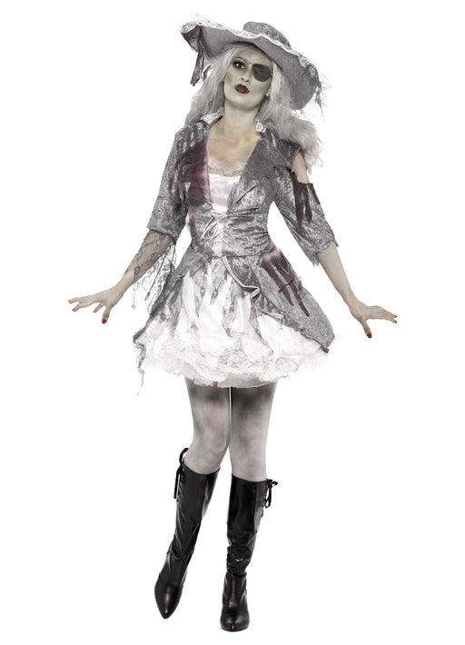Deluxe Ghoulina Halloween pirate costume includes detailed grey top, skirt, bolero jacket and matching hat. Add some make-up and cutlass sword to c...