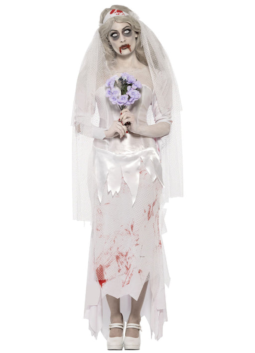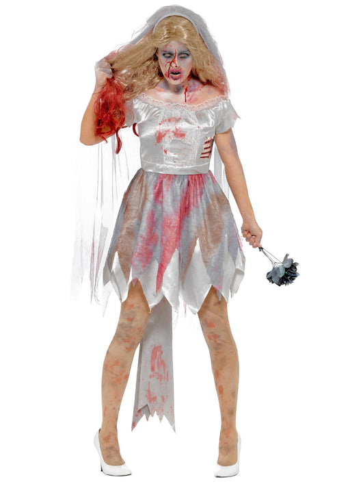 This zombie Bride Halloween costume comes with a grey distressed effect layered dress with blood stains and latex rib wound, long grey headband ve...