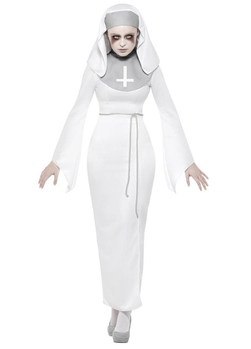 White haunted zombie nun Halloween costume with long dress finished with grey chest piece with upside down cross, grey rope belt and habit headpiec...