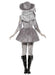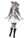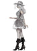 Outfit includes torn silver velvet effect pirate style dress with attached inner white layer, netted lace arm cuff and silver lace to finish off corset style front. Also included is the matching hat with gold trim.