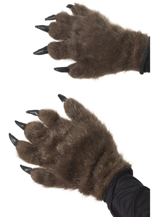 Pair of brown Halloween monster or animal hands with black nails and faux fur.