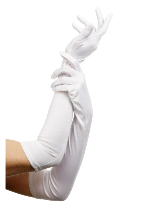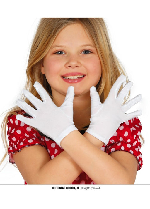 One size fits most white fabric adult gloves, made from 100% polyester.