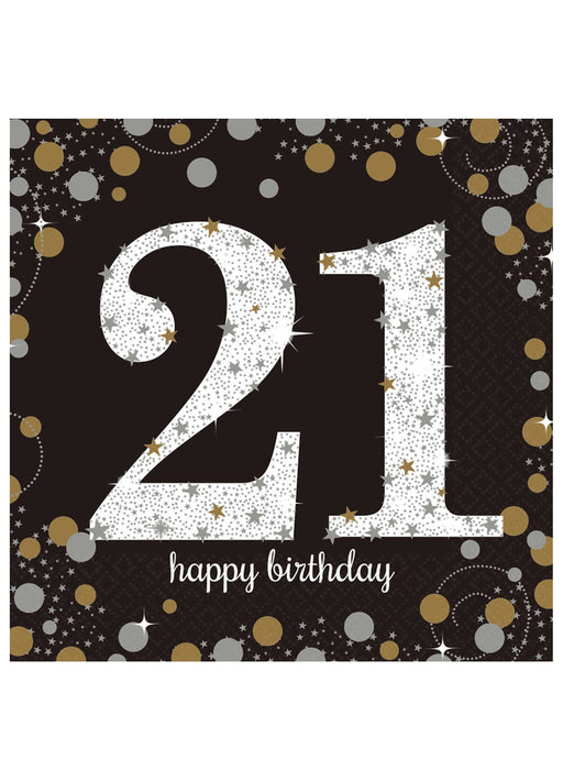 Pack of 16 2 ply sparkling gold and black celebration age 21 lunch napkins.