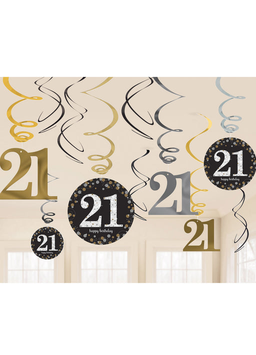 Pack of 6 age 21 foil swirl decorations with different size cutouts in gold, black and silver.