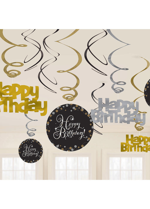 Pack of 6 Happy Birthday foil swirl decorations with different size cutouts in gold, black and silver.