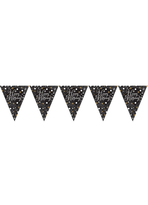 Happy Birthday black, gold and silver flag bunting banner measuring 4 metres (13ft) long.
