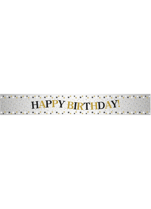 7ft (2.13m) long Happy Birthday letter banner in gold, silver and black.