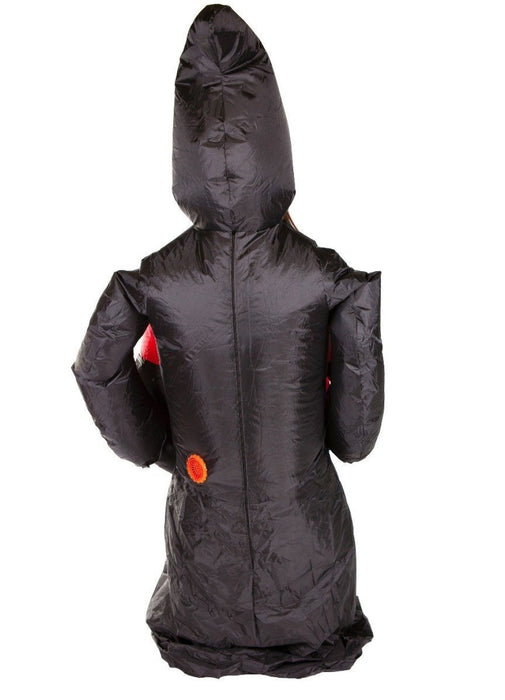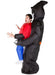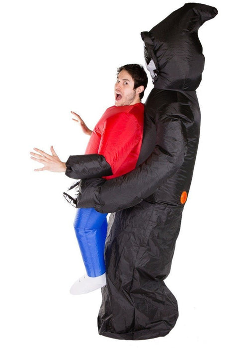 Inflatable unisex Grim Reaper Halloween fancy dress costume consisting of full body zip up jumpsuit & built in fan. One size fits most adults. Fan inflates costume in seconds & lasts up to 7 hours. Requires 4 x AA batteries which are not included.