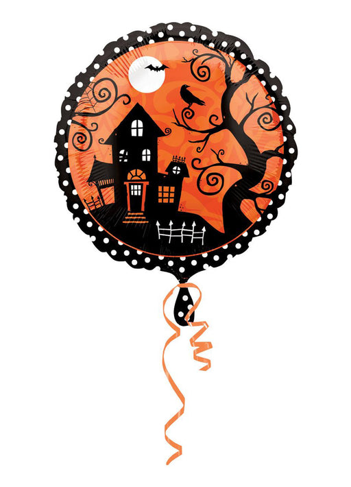 Halloween themed haunted house 18" foil balloon decorated with haunted house, creepy tree & spider imagery on orange background with black &...