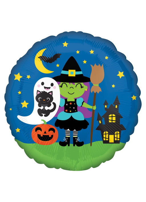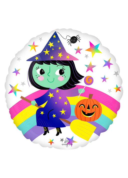 Rainbow witch Halloween themed round 17" foil balloon. Click & Collect orders: Balloon supplied inflated with helium. Delivery orders: Balloo...
