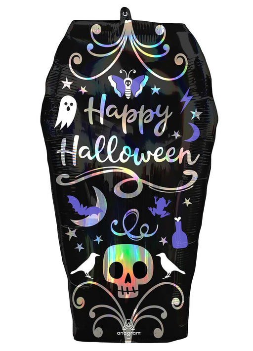 Holographic Halloween coffin shaped foil balloon measuring 38 cm x 68 cm (15" x 27") when inflated. Click & Collect orders: Balloon supplied ...