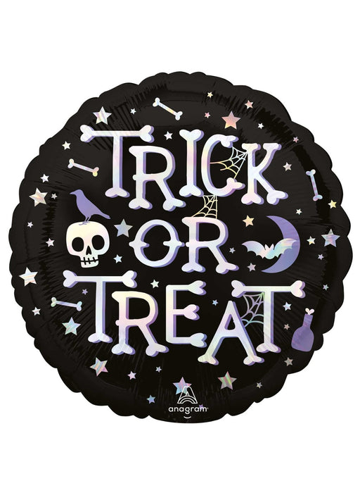Holographic Halloween themed 17 inch round foil balloon with Trick or Treat print design. Click & Collect orders: Balloon supplied inflated w...