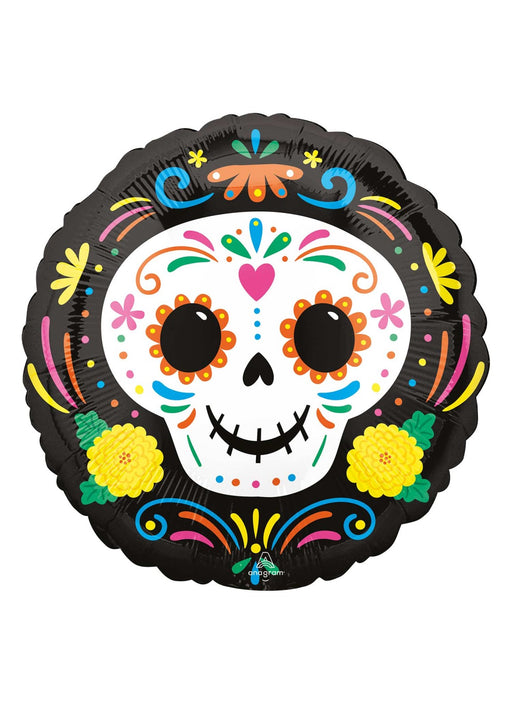 Day of the Dead Skull colourful Halloween themed round 17" foil balloon. Click & Collect orders: Balloon supplied inflated with helium. Deliv...