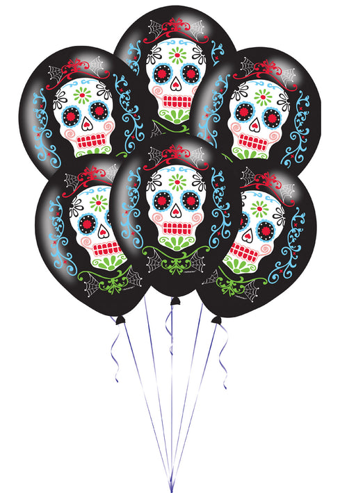 Pack of 6 Day of the Dead themed latex balloons decorated with colorful skull and flower print.